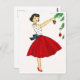 Ung kvinna i röd klänning som dekorerar Julgran Vykort