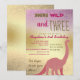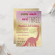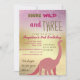 Söt, unik, rosa dinosaurie siluett i kombination med bedårande glitter rosa och guld bakgrund. Trendig, modern, söt inbjudan till 3-årsdag för litet tjej födelsedagsfest.