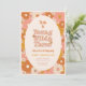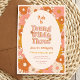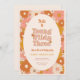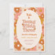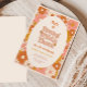 "Unga, vild och tre" groovy retro 3:e födelsedagsinbjudan har en mönster av visuella vilda blommor, i en bohemisk färg palett med terracotta, beige, rosa och gult.