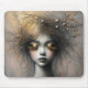En serene ansikte med stängt ögon är försedd med ömtåliga, guld-accelererade ögonfransar och omgiven av ett klokt, klokt hår