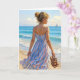 En kvinna i en strimlad sundress stullar längs en sandstrand, som håller sina sandaler i ena handen, medan vågar varsamt ligger vid stranden. Text kan ändras.