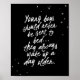 En underbar tavla för din babypojkens barnkammare som citerar från historien om Peter Pan, "Unga pojkar bör aldrig läggas till sodos... de vaknar alltid upp en dag äldre", i en fet kursiv text med ett handskrivet utseende. Modern typografi tryckt i vitt på en trendig svart bakgrund dekorerad med en strödd av små stjärnor i två hörn.