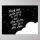 En vacker trycksak till din babypojkens barnkammare som citerar ur berättelsen om Peter Pan, "Unga pojkar bör aldrig skickas till söns... de vaknar alltid upp en dag äldre", i en fet kursiv text med ett handskrivet utseende. Modern typografi tryckt i vitt på en trendig svart bakgrund dekorerad med en fluffig vit moln och en strödd med små stjärnor. Ett vackert tillägg till ett barns sovrumsgalleri vägg.