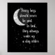 En fin utskrift för din pojke förskolelag som citerar från Peter Pans berättelse: "Unga pojkar bör aldrig skickas till sängs... de vaknar alltid upp en dag äldre", i en kursiv text med ett handskrivet utseende. Contemporary-typografi som är helt tryckt i vitt på ett trendig svart bakgrund som dekoreras med ett halvmånsfärande måne och en spridning av små stjärnor.