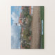 Stå i ett fält i den ungerska bygden som tittar kyrktornerna och byggnaderna av en town. Moln är i blå himmel, men väder återstår soligt och varmt.