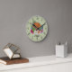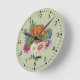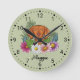 Desteis ursprungliga tecknad illustrerar en söt ungersk Vizsla-rasad hund huvud i närheten omgiven av färgstarka sommarblommor. Det finns en rosa blomma, en lila blomma, en mörk rosa blomma och en vit daisy blomma tillsammans med en del grönt löv och grenar. Bakgrunden färg är grönt med en ljuspolka punkt mönster. Bakgrunden till färg kan ändras till vilket annat färg som helst och polkatolpunkten mönster kan tas bort om så önskas. Timmarna är markerade med siffror. Timmarna och minuterna visas med en prickad klocka ansikte. Det finns också ett anpassningsbara textområde för en namn eller annan anpassningsbar i ett underbart skriptteckensnitt.