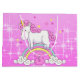 En söt enhörn står på en färgstark regnbåge i en rosa och sparsam himlar.