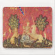 Röd bakgrund på medeltida tapeter av majs, enmajs och lejon under träd. Vintage bra konst European tapestry. Offentlig domänavbildning.