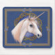 Fint vitt Unicorn-huvud inramat med keltisk knackcirkel och blå denim-bakgrund.