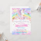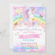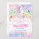 Flickfödelsedag inbjudan, enhörning, regnbåge, stjärnor, guld glitter.