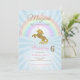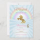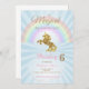 Unicorns födelsedagsinbjudningar har en gyllene glatt enhörning på dem. Bakgrunden är blå och har en regnbåge! De här inbjudningarna säger: "En magisk dag är på väg!"