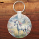 En nyckelkedja som visar en drömbild av en vit enhörning med en regnbåge i fält av blommor. I bakgrunden finns stora berg. Perfekten är en gåva till ge till dem som kärlek magiska och mystiska unicorns. Innehåller generativ innehåll.