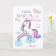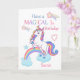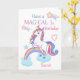 En söt och söt, magisk enmajsformat med en färgstark enmajsfärg som står på ett moln och regnbåge med en bakgrund av fotografering av stjärnor och hjärtan.Kortet har ordalydelsen - Ha en magisk födelsedag i ett färgstarkt teckensnitt. En söt, söt och magisk design för en liten flicka som blir ett år gammal. Ett underbart första födelsedagskort för din dotter, barndotter eller brorson. Kan vara personlig genom att ändra texten från namn vid grund på kortet och sedan ändra det meddelande som för närvarande läser , Ha en magisk första födelsedag, många kärlek XX