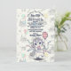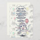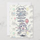 Vitmisk enhörningskallelse med en söt enmajs med en ballong, vintage-stil gräns och handdragna doodlar av kastlar, stjärnor och gåvor. Mjuk pastel färg anger tonen för ett glatt, magiskt firande.