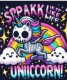 En tecknad enmajsbeläggning på en regnbåge med gnistor och moln.