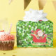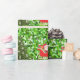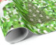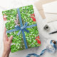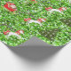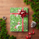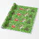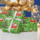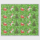 Julinslagning papper med en enhörning som drar tomtens själ mot ett Julafton träd dekorerat med silver baubles. Unicornen har en röd och gyllene mane och svan, och slummet bär tomten tillsammans med många gåvor. Bakgrunden är en simulerad grönt glitter som består av liten grönt och vitt mosaikliknande delarare.