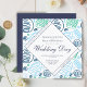 Modern, unik Blått Abstrakt, en konsthögd inbjudan. En unik inbjudan med blå och grönt abstrakt hand plockade one line art mönster. Texten finns inuti en romb form. Du kan enkelt anpassa all text - anpassa den med namn, namn, datum och tid, plats och ändra eller radera all text på kortet.