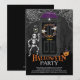 Cute Halloween-inbjudan med en svart ytterdörr med en halloween-krans som är förskönad med spindelnät, jack o lantern, fladdermus och spöke. Tillförd med vit typografi av skelett och contemporary. Enkel att anpassa sig med din heminformation om halloween. Glöm inte att anpassa med DITT HUSNUMMER bredvid dörren!