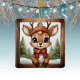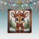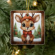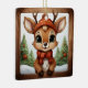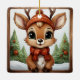 Unikt renrustikt fyrkantigt keramiskt ornament med en brun träram, julscen med söta små skogsdjur rådjur med horn i en seriefigur grafisk konststil som bär mössa och halsduk, stående i förgrunden. Bakgrunden inkluderar vintergröna Xmas-träd och vintersnölandskap, vilket fullbordar charm för julen med denna skogsdjur-doe-karaktär illustration dekoration, vilket gör en bra present. Älgälskare design på fram- och baksidan. Oavsett hur dekorationen vänds ser den alltid festlig och komplett ut.