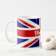 Den färgstarka rödvita och blå Union Jack-flagga från Förenade kungariket visade här med ett lustigt slang svär ord citat, "Bloody Helvete". Ord blodig... är en korruption av Guds blod, en fras som användes så långt tillbaka som 1700-talet... helvetet tillkom senare. Detta idiom är ett mycket informellt och oförskämt sätt att uttrycka underbar ilska. Du kan redigera den här texten med valfri text eller radera texten helt om du föredrar mugg utan den.