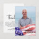 Ett enkelt tackkort innehåller ett exempelmeddelande som du kan använda eller byta till ditt eget ord på baksidan och dina nära foto och en vattenfärg på flagga Förenade Stater på framsidan. Snygg för anpassningsbar tackkort för firande av liv, begravning eller minnesmärke. MATCHING-objekt i vår samling.