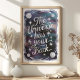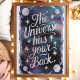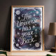 Denna fängslande väggkonst visar den uppmuntrande frasen "Universum har din rygg" omgiven av en hypnotisk kosmisk scen med stjärnor, månar och en drömlik galaxbakgrund. Designen använder sig av skimrande silvertext mot en djup, himmelsblå färgpalett och skapar en inspirerande och mystisk stämning. Perfekt för att tillföra en touch av kosmisk underbarhet och positivitet till vilket rum som helst, fungerar detta konstverk som en vacker påminnelse om att universum stöttar dig.