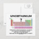 Unobtainium är känt för att vara ett helt otillgängligt inslag, men har varit med på nyheterna den senaste tiden. Vetenskapliga kunskaper om humankapitalet med någon av dessa presenter som har Periodiska Bord i Inslag, tillsammans med följande påstående: "Unobtainium ? Helt icke-grundläggande Inslag, hittades inte i det periodiska Bord, kan inte erhållas eftersom ingen vet var det ska hittas". Ingen behöver vara kemi eller kemist för att njuta av någon av dessa kemiska gagggåvor i dag! Perfekter för all fläkt av unobtainium, universums mest ouppnåeliga inslag!