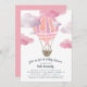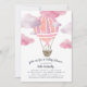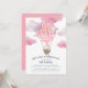 Fira din lilla babyflicka på väg med denna söta inbjudan till baby shower i mjuka pastellfärger i akvarell. Designen har en illustration av en varmluftsballong i persika och rosa, omgiven av rosa och gråa moln, med dina evenemangsuppgifter under i rökigt blågrå bokstäver.