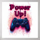 En svart videospelsstyrenhet med röda accenter visas mot en vit bakgrund. Styrenheten är placerad i bildens mitt, med frasen "Power Up!" i pixelformat, rosa brev ovanför den. Bakgrunden är ett stiliserat kretskort mönster i Tones of rosa and blue, som skapar en stark och energisk atmosfär.