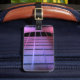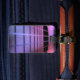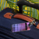 Stäng ett foto av gitarr med strängar och hål i nyp och lila.