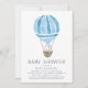 Fira pojke på vägen med den här söta och enkla babyduschinbjudan i blått och akvatiskt vatten. Utformningen har en luftballong med blått, turkos och brunt, med information om händelsen under i rökblått grått-tecken.