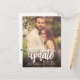 Meddela din "bröllopsdagsuppdatering" med stil med dessa enkla och moderna reviderade spara datum-kort som presenterar ditt porträtt förlovningsfoto med en rustik borstat skript överlagringsdesign. Inkluderar text på framsidan och baksidan av vykortet som kan anpassas med alla viktiga detaljer. Observera att den mörka fotogradientfiltret kan tas bort.