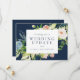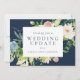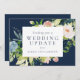 Behöver du ställa in eller skjuta upp bröllop på grund av en olycklig katastrof? Pandemi? Orkanen? Död i familjen? Skicka ett meddelande till vänner och familj med det här elegant marinkortet med två sidor i blommigten. I baksidan finns ett stort textblock med anpassningsbar med förslagna formuleringar. Du kan också lägga till ditt nya datum, webbplats eller länk till en direktuppspelningstjänst för online. Framsidan har en marin blå bakgrund med vit text och en vattenfärgad blommigt ram. Färg kan redigera genom att klicka på anpassa.