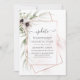 Uppskjuten inbjudan till bröllop om anmälan med anemonblommor och eukalyptus löv i ett koppargeometriskt ram.