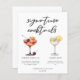 Den här uppfriskande och fruktiga menyn för namnteckning cocktails på lakan har en enkel svart typografi över 2 drycker och deras ingredienser för din bröllop pub. En söt Cherry-Fransk 75 och Lemon Drop teckning lägger till en coola i pub-menyn. Fyll i med parets namn och mottagningsdatum.