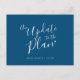 Uppdatering till planen bröllop avbokningskort är en del av den matchande enkla typografiska hjärtat marinblå och vita bröllopssetet. Perfekt att använda som ett bröllopsinformationskort för att informera dina gäster om ett bröllop eller evenemangsavbokning, eller för att boka om på grund av sjukdom eller oförutsedda omständigheter. Andra färgalternativ finns tillgängliga. Originaldesign av Sarah Trett för www.mylittleedenweddings.com på Zazzle.