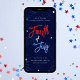 Fira Amerikas födelsedag med den här roligten och patriotisk 4:e juli-festinbjudan med fyrverkerier och stjärnor på en mörk blått bakgrund med rödvit och blå typografi.