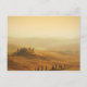 Vykort med soluppgång över berömden Podere Belvedere villa i ett landskap med oren, rullande backe i Val d'Orcia i Toskana, Italien.