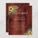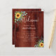 En modern elegant, bröllopsprogram, tidslinje. Rustiskt brun trä som bakgrund. Dekorerad med solblommor, grönt vattenfärgad eukalyptus greenery. Anpassa och lägg till information om namn och bröllop. Om du har mer text kan du minska radavståndet och ta bort dekorn på baksidan.