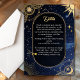 Upptäck bröllop-sviten med det här Celestialkortet för Sol och Måne genom att slå svart och guld. Med intrikata illustrationer av sol och måne i guld i strålningen, omgivna av ömtåliga stjärnor, fångar detta kort mystiken hos kosmos. Med en svart bakgrund på riken balanserar konstruktionen på ett vackert sätt elegans med viktig bröllop-information. Kortet är idealiskt för att transportera inkvarteringar, riktningar eller speciella anteckningar. Det ger en magisk, stjärnartad beröring till det berömda temat firande.