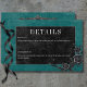 Transport dina gäster till en värld av mörk, elegans med vårt vintage gothic bröllop-informationskort. Den djupa tealbakgrunden för åldras anger scenen för en slående kontrast, eftersom fet vit text kommer från komplicerade svarta textrutor. I höjdpunkten på inbjudan fångas det centrala i mystik och romantik av en tredimensionell gothisk gräns med en regal svart korv. Baksidan är försedd med två sammanflätade vindruvor av svart ro som subtilt bildar ett hjärta runt två omfamnande ravens, vilket tillför en aning dramatisk allure. Släpp magin och ange tonen för en oförglömlig bröllopsdag. Kortet är en del av Gothic Black Raven & Black Ro Teal Bröllop Suite skapat av enbart Farmhouse Press.