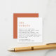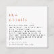 Uppgifter om Mini Simple Typography Terracotta Bröllop. En lysande storlek 2,5-tumsruta i miniatyr som följer med dina inbjudningar. Huvudet är stort och i gemener med snyggt med detaljerna under och mycket tomt utrymme på en kvadratisk form för en contemporary stil. Anpassa texten till dina egna detaljer.
