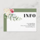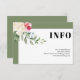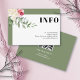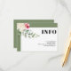 Kortet ram och gren med rosa ros och vita blommor bröllop. Lägg till lite elegans i bröllop med det här krävande kortet för höljet. Med ett känsligt vitt ram och en sofistikerad sage grönt gräns visar det ett romantiskt gren med mjukt rosa ros och vita blommor i det övre lämnat hörnet. "INFO" i ord är en framträdande plats i fet typografi, där gästerna uppmanas att utforska mer detaljer. Den omvända sidan är försedd med en pulserande grönt bakgrund och en praktisk QR-kod som gör att gästerna enkelt kan söka efter ytterligare information.