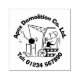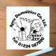 Manipulergummi frimärke, befrielseentreprenör. Att förstöra boll på en kedja som slår ner ett byggnad. Befordra ditt företag med rivningsföretag med en nyare luft som har en illustration av en bulldozer med en tecknad för roligt, plus företagets namn och kontaktnummer.