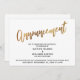 Denna svits utmärkande beror på det moderna, handskrivna typsnittet som används för accentfraser. I denna del användes det handskrivna teckensnittet för att skapa en enkel grafik som läser "Announcement", stor och fet. Grafiken har förstärkts med en falsk-metallisk slät guldeffekt. Ordföringen i min platshållartext är riktad mot ett bröllop som skjuts upp, men om din händelse ställs in kan denna design också tillgodose det behovet. Använd mallfälten för att lägga till dina personliga detaljer och gör denna unika, moderna design till din egen. Bakgrunden kan ändras till valfri färg du föredrar. Vänligen kontakta oss med eventuella specialförfrågningar eller för anpassningshjälp. // 105 //