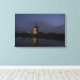 I Canvas landskap trycks belysta historiska vindkraftverk med reflektion i floden vatten under blåtimmen i början av natten i Kinderdijk i Nederländerna. Underbar dekoration på väggen!