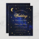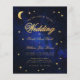 Ett budgetbröllop för ett berömvärt bröllop-tema, med guld-stjärnorna och måne på en stjärnblå nattblå bakgrund. Ord Bröllop och namn är skrivna i ett kalligrafiskt manus för elegant. Måne och ord Bröllop är faux guld foil, resten är gyllene. På svart finns bara måne och stjärna på en stjärnblå nattblå bakgrund. Fotot från stjärnnatten är av Felix Mittermeier från Pixabay och det är gratis för kommersiell använda.