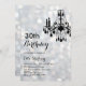 En finare-chandelier mot bakgrund av silver ljus accentuerar denna födelsedagsinbjudan.