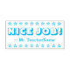 Den här inspirerande gummidesignen i frimärke innehåller det inspirerande återkopplingsmeddelandet "NICE JOBB!" och anpassningsbarnas lärares namn. Den har också en dekorativ stjärnkonturform. Det skulle kunna användas av en skollärare, lärare eller lärare när de markerar uppdrag för att erkänna att student har gjort bra ifrån sig.