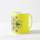 Grundläggande vitmugg som dekoreras med "uppmuntrandesignen. Designen omges av en gul bakgrund, och den klippas med en grön gräns.